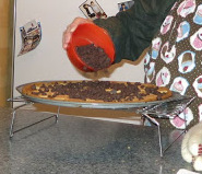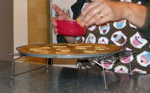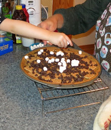 Taking a greased pizza pan (or a baking sheet if you don’t mind it not looking like a pie) roll the entire package of Pillsbury Chocolate Chip Cookie Dough until it is fairly even and touches the edge of the pan.
